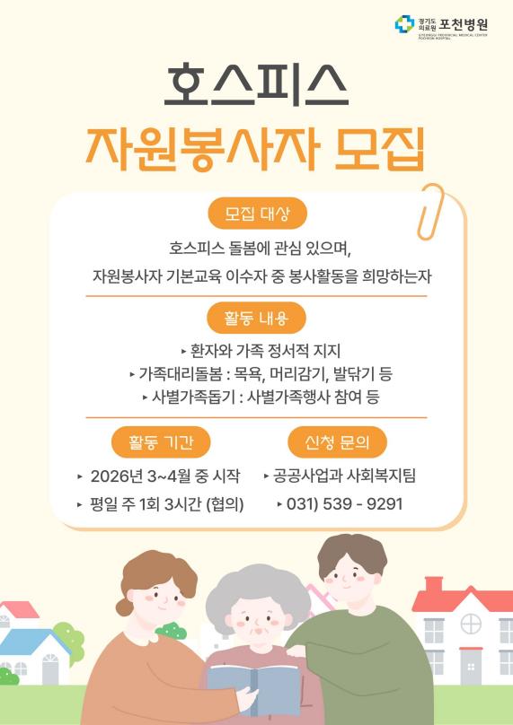 경기도의료원 포천병원은 지역사회 말기 환자와 가족을 위한 돌봄 제공을 목적으로 2026년 3월 호스피스 병동 개소를 준비하고 있습니다. 이에 따라 호스피스 자원봉사에 관심 있는 분들을 대상으로 호스피스 자원봉사자 양성교육 및 봉사활동 참여에 대해 안내드립니다. 자원봉사는 일반적인 봉사활동과 달리 말기 환자와 가족을 이해하고, 존엄한 돌봄을 제공하기 위한 기본 교육 이수가 필요한 봉사활동입니다.