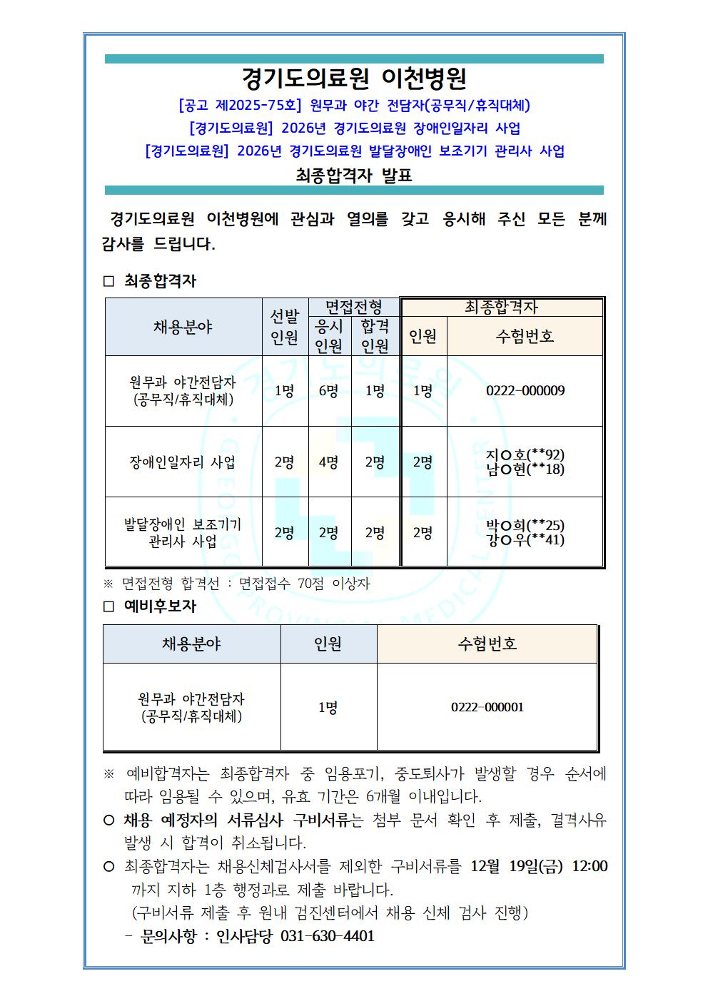 최종합격자 및 예비합격자 발표, 구비서류 안내(2025-75 원무과 야간 전담자(공무직/휴직대체), 2026년 경기도의료원 장애인일자리 사업, 2026년 경기도의료원 발달장애인 보조기기 관리사 사업)