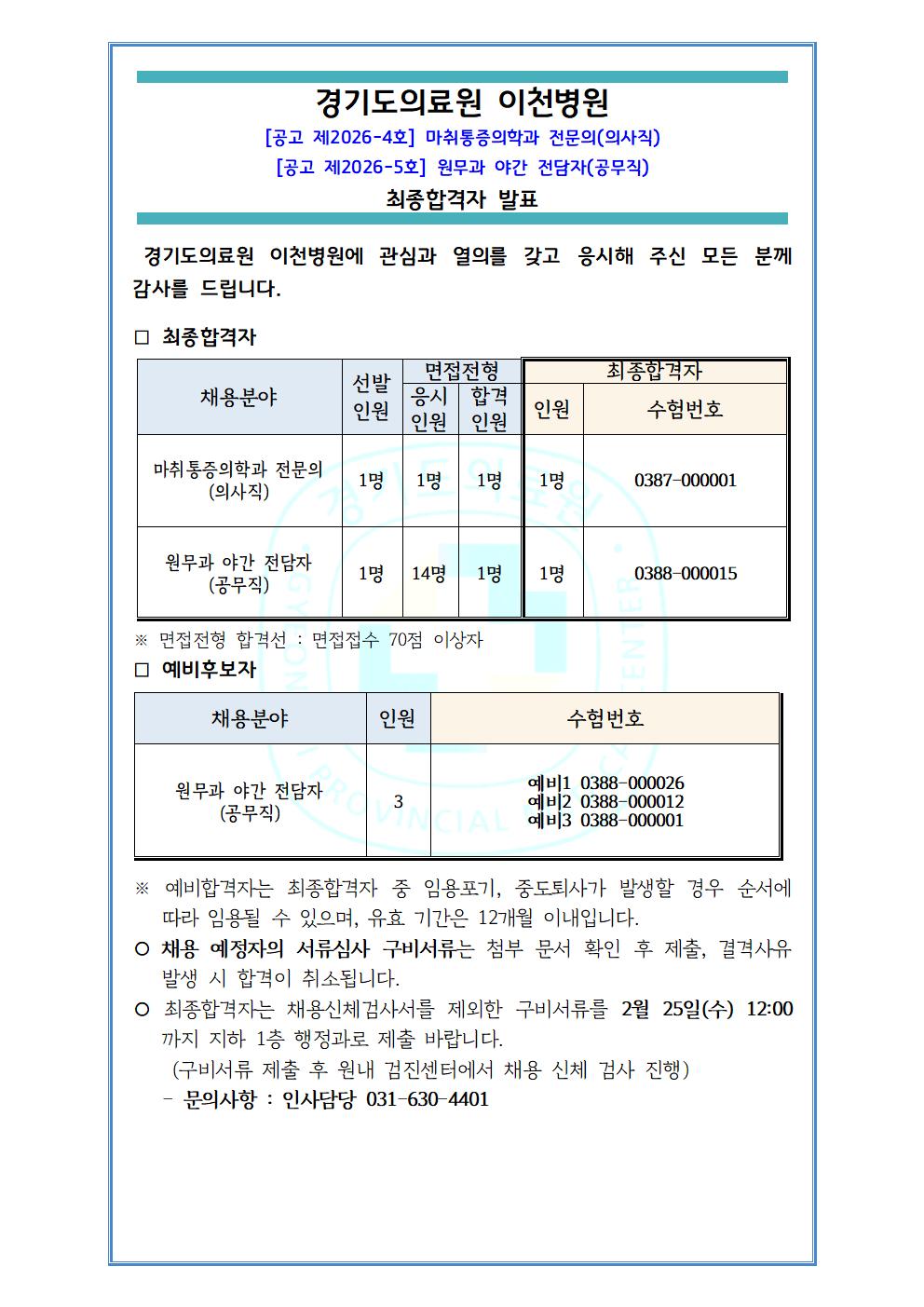 최종합격자 및 예비합격자 발표, 구비서류 안내(2026-4 마취통증의학과 전문의(의사직), 2026-5 원무과 야간전담자(공무직))