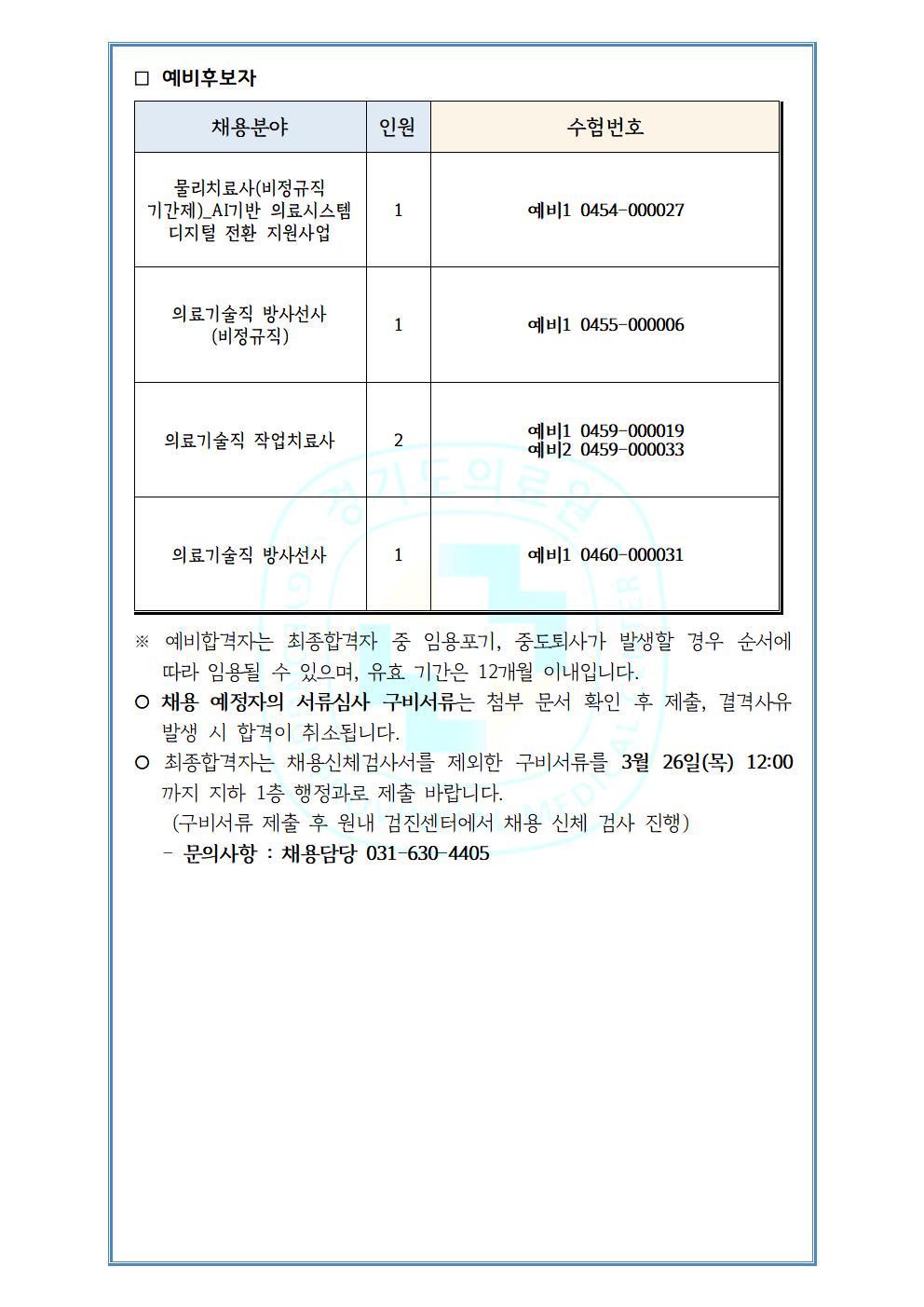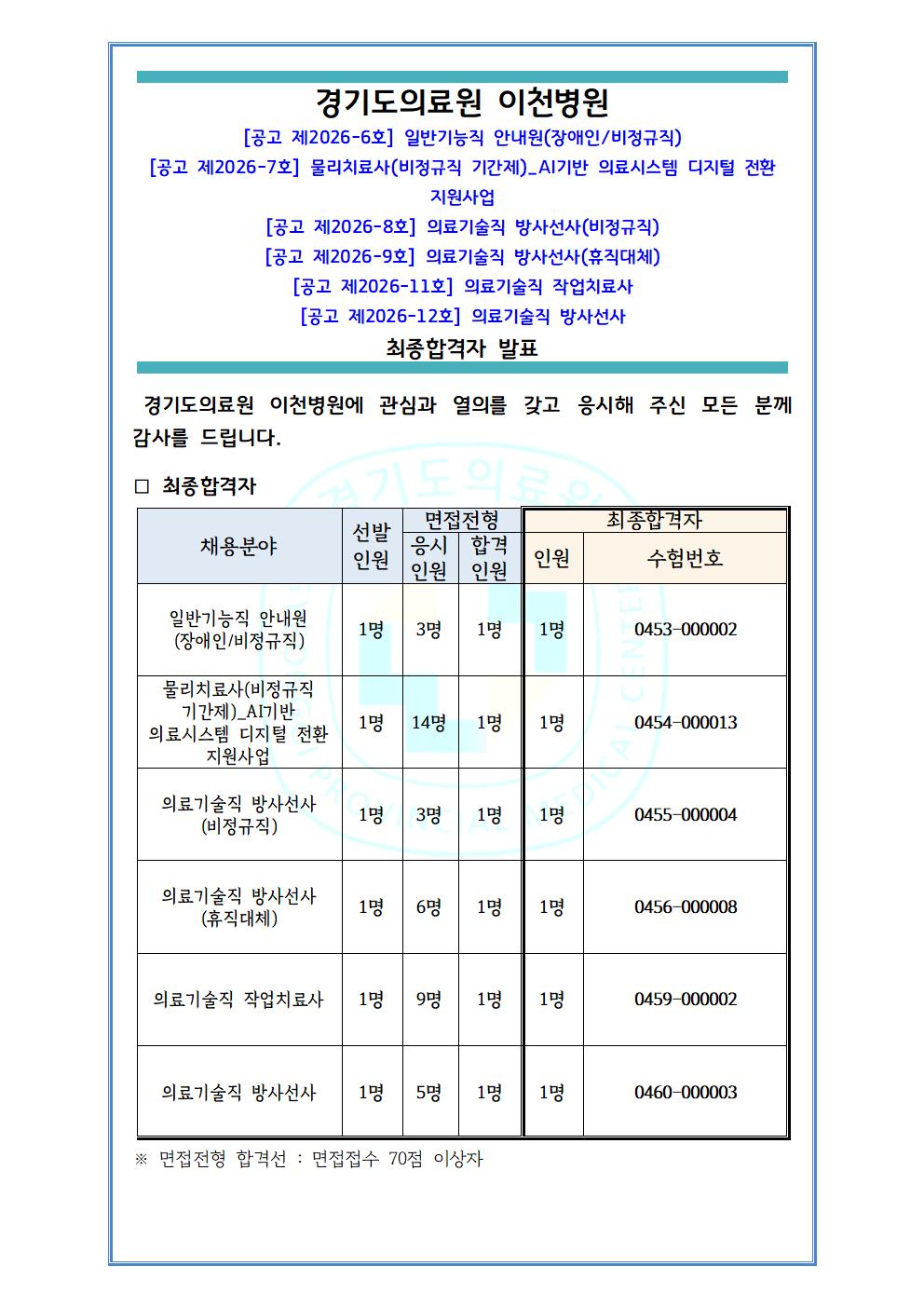 최종합격자 및 예비합격자 발표, 구비서류 안내(2026-6호 일반기능직 안내원(장애인,비정규직), 7호 의료기술직 물리치료사(비정규직 기간제), 8호 의료기술직 방사선사(비정규직), 9호 의료기술직 방사선사(휴직대체), 11호 의료기술직 작업치료사, 12호 의료기술직 방사선사)