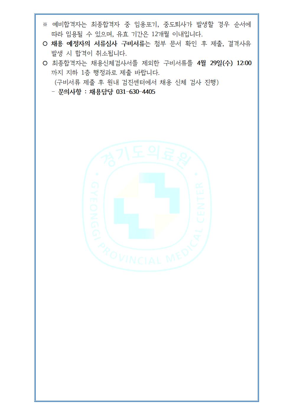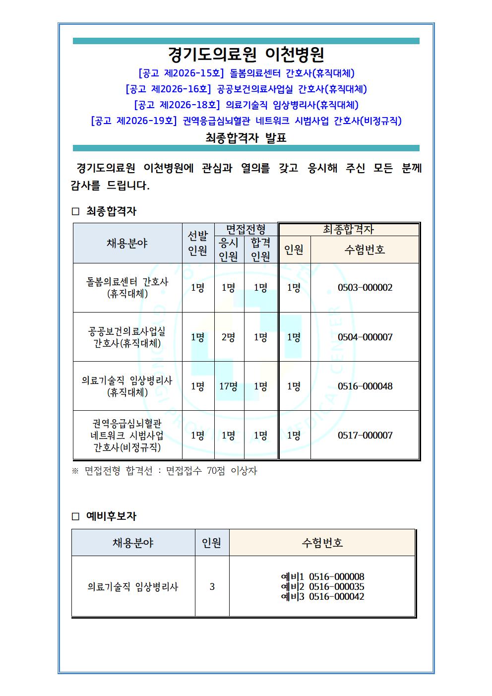 최종합격자 및 예비합격자 발표, 구비서류 안내(2026-15,16,18,19 돌봄의료센터 간호사(휴직대체), 공공보건의료사업실 간호사(휴직대체), 의료기술직 임상병리사(휴직대체), 권역응급심뇌혈관센터 네트워크 시범사업 간호사(비정규직))
