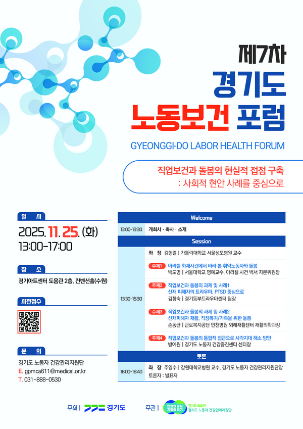 【경기·남부 = 서울뉴스통신】 김인종 기자 = 경기도(주최)와 경기도 의료원(주관)은 오는 11월 25일 (화) 오후 1시, "직업보건과 돌봄의 현실적 접점 구축"을 주제로 '제7차 경기도 노동보건포럼'을 경기아트센터에서 개최한다.