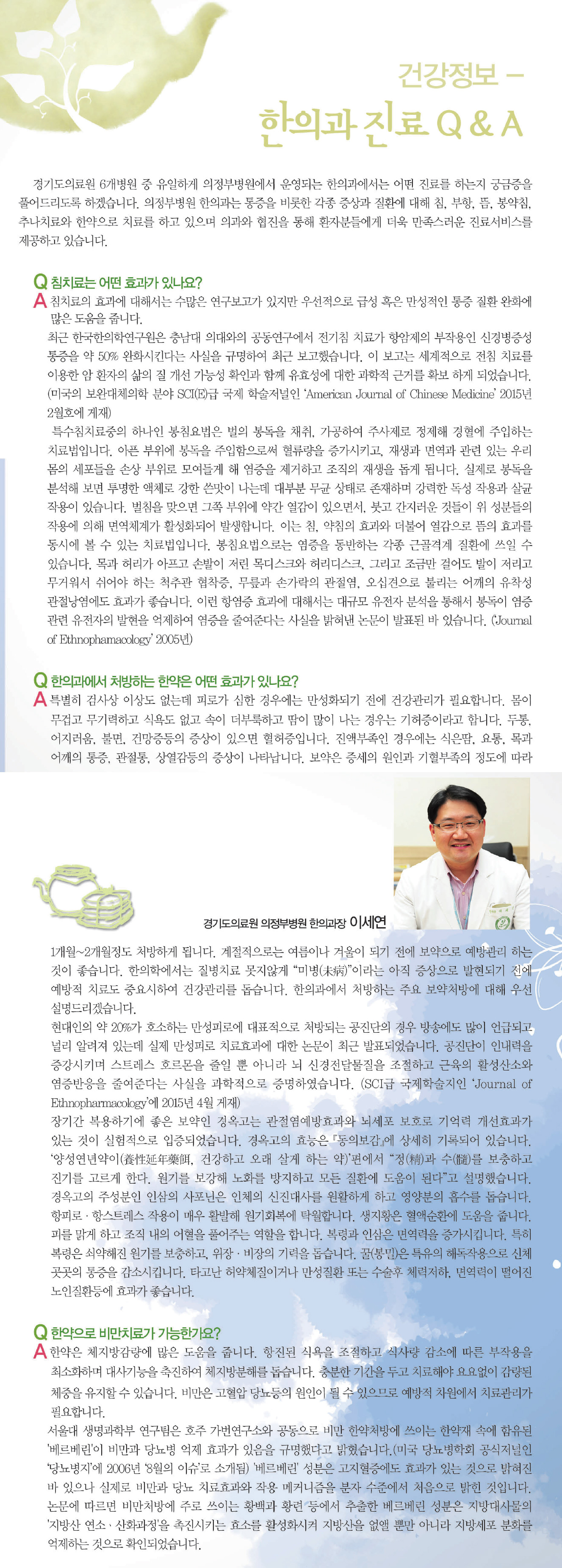 ![]() 건강정보 - 한의과진료 Q&A 경기도의료원 6개병원 중 유일하게 의정부병원에서 운영되는 한의과에는 어떤 진료를 하는지 궁금증을 풀어드리도록 하겠습니다. 의정부병원 한의과는 통증을 비록한 각종 증상과 질환에 대해 침, 부항, 뜸, 봉약침, 추나치료와 한약으로 치료를 하고 있으며 의과와 협진을 통해 환자분들에게 더욱 만족스러운 진료서비스를 제공하고 있습니다. Q 침치료는 어떤 효과가 있나요? A 침치료의 효과에 대해서는 수많은 연구보고가 있지만 우선적으로 급성 혹은 만성적인 통증 질환 완화에 많은 도움을 줍니다. |