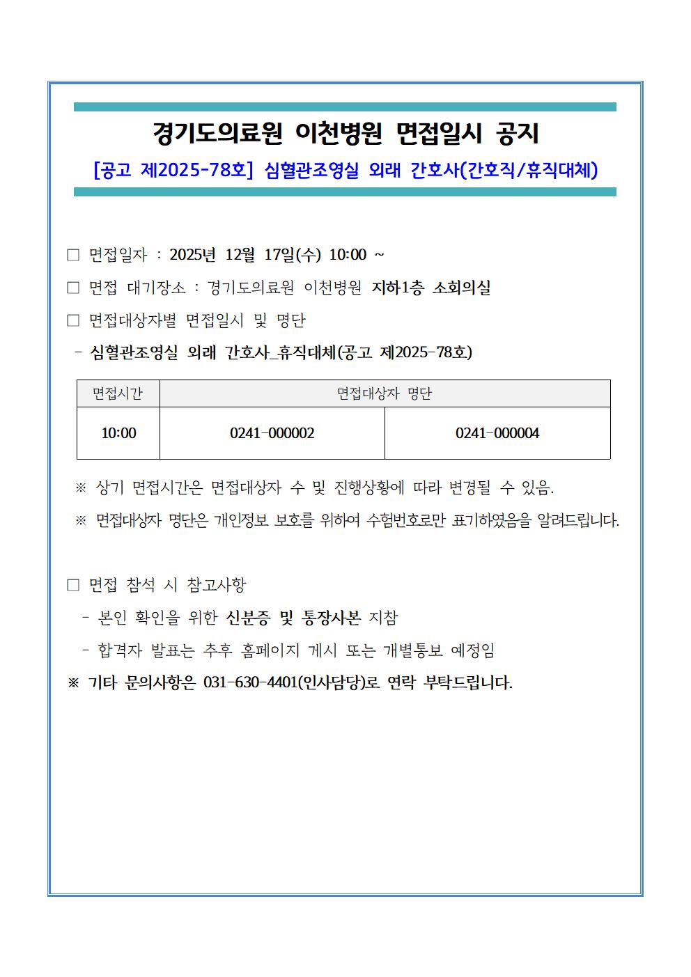 서류전형 합격자 발표 및 면접전형 안내(2025-78호 심혈관조영실 외래 간호사(간호직/휴직대체))
