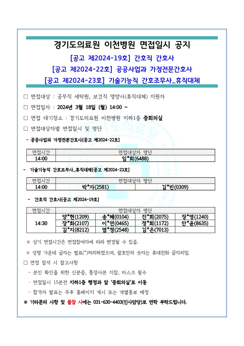 공고2024-19호 간호직 간호사, 공고2024-22호 가정전문간호사, 공고2024-23호 기술기능직 간호조무사 서류전형합격자 및 면접일정 안내
