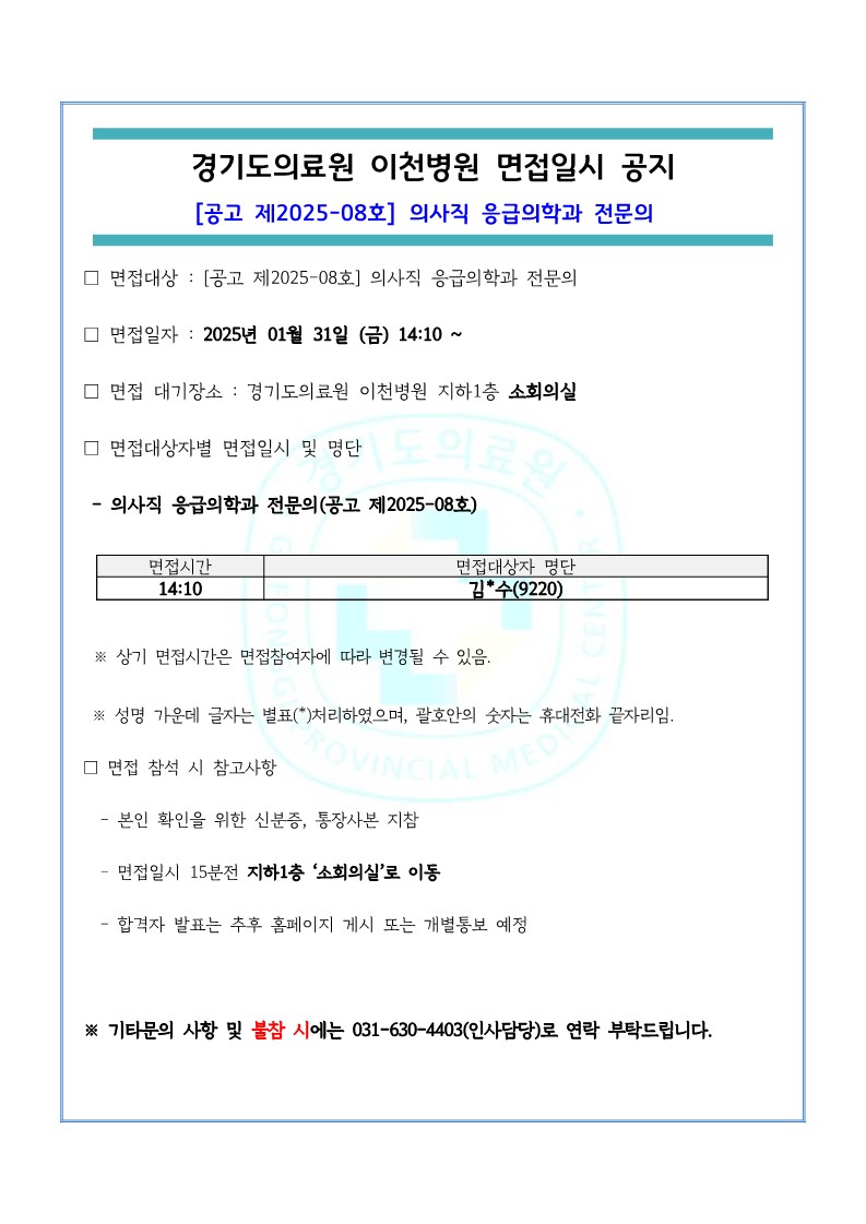 서류전형 합격자 발표 및 면접전형 안내(2025-08 응급의학과 전문의)