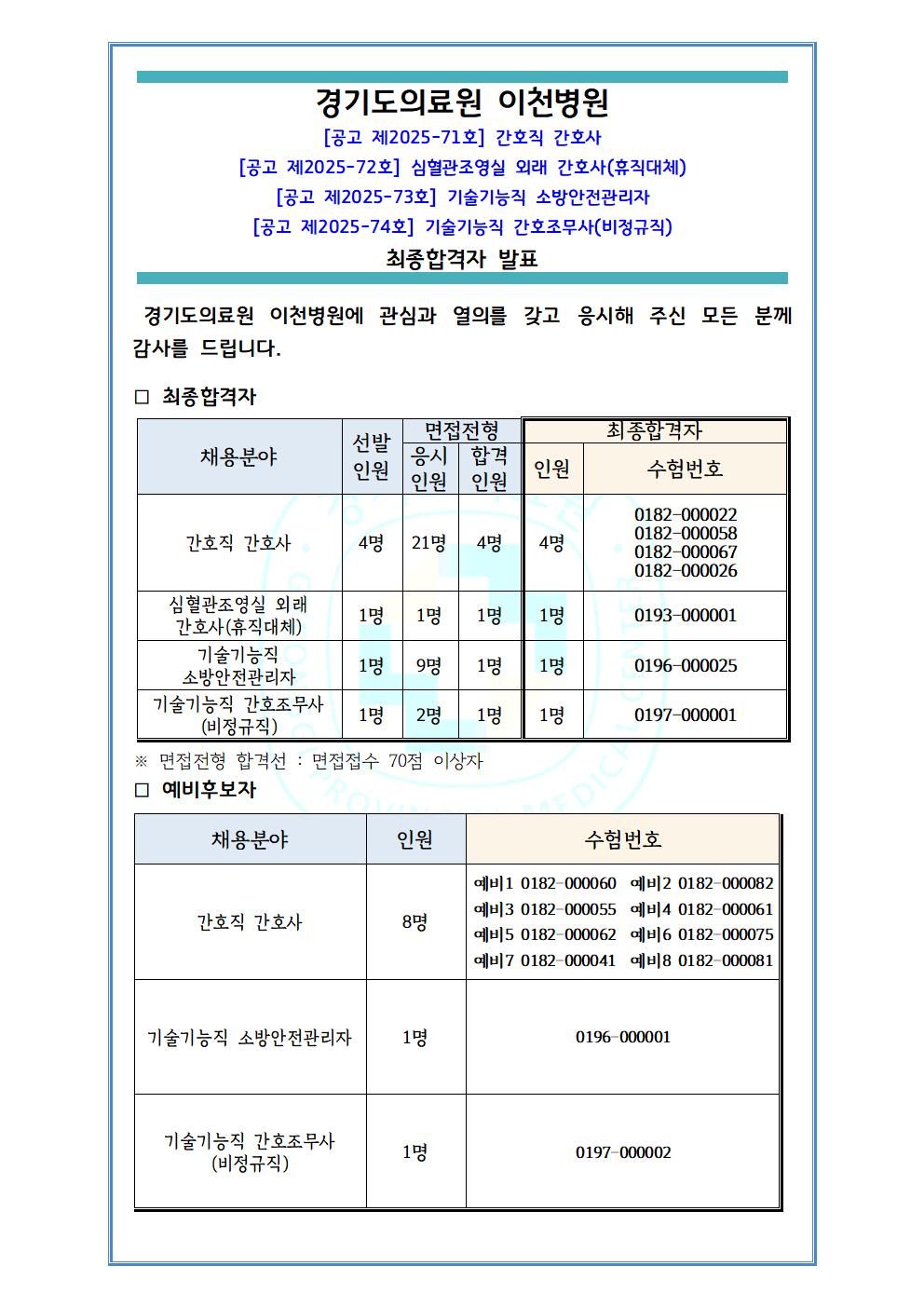 최종합격자 및 예비합격자 발표, 구비서류 안내(2025-71 간호직 간호사, 2025-72 심혈관조영실 외래 간호사(휴직대체), 2025-73 기술기능직 소방안전관리자, 2025-74 기술기능직 간호조무사(비정규직)