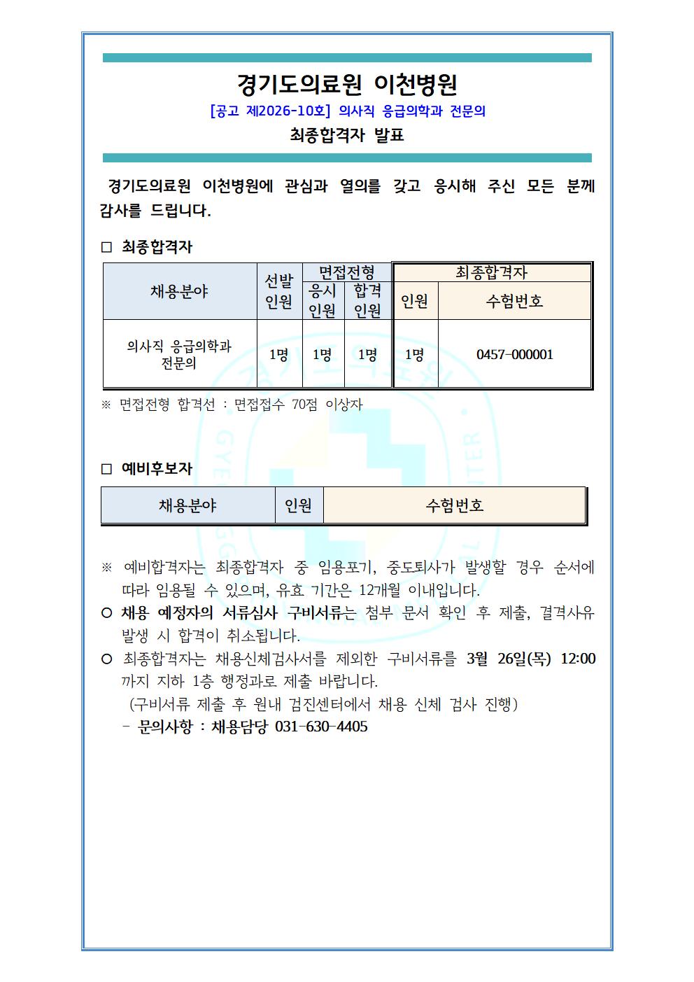 최종합격자 및 예비합격자 발표, 구비서류 안내(2026-10호 의사직 응급의학과 전문의)