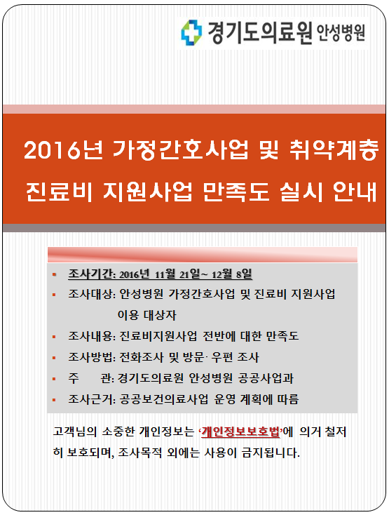 2016년 가정간호사업 및 취약계층 진료비 지원사업 만족도 실시 안내